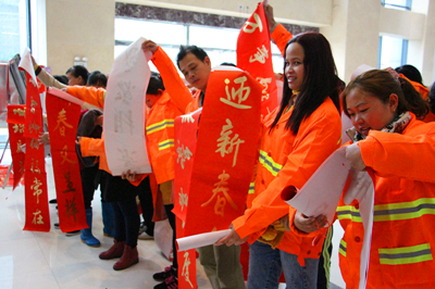 “春滿人間百花吐艷 福臨小院四季常安” “一帆風(fēng)順年年好 萬事如意步步高” ……1月26日至28日,麗匯大廈一樓熱鬧非凡,為了感激社會各界對綠港集團的關(guān)心與支持,由綠港集團工會組織的書法家“迎新春 送祝福”義務(wù)送春聯(lián)活動吸引了大量前來求墨寶的社會各界人士。三位南寧市書法協(xié)會的書法家以及南寧科巨公司副總經(jīng)理陸章發(fā)為觀眾們現(xiàn)場揮毫,一幅幅金燙燙、散發(fā)著墨香的春聯(lián)映襯著人們的笑臉,整個現(xiàn)場彌漫著濃濃的年味,短短三天時間便送出了2000多副春聯(lián)。1月26日上午,綠港集團工會還啟動了派送春聯(lián)儀式,綠港集團工會主席黃麗琴帶領(lǐng)工會人員將春聯(lián)送到經(jīng)開區(qū)40余位保潔人員、園林綠化工人、公司職工的手上。(張彩秀/文、圖)