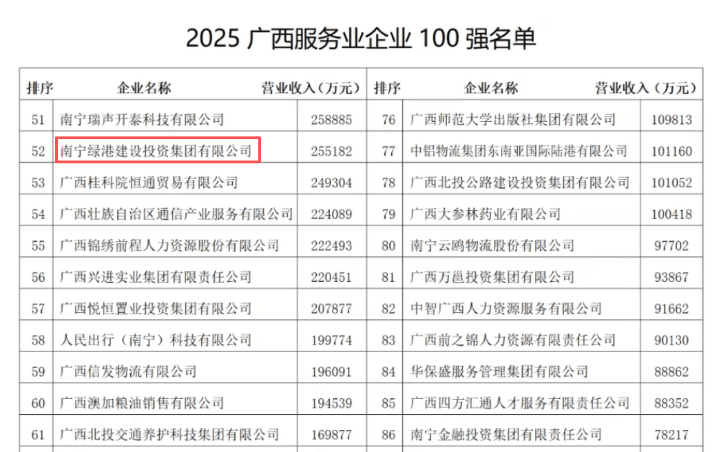 近日,廣西企業(yè)與企業(yè)家聯(lián)合會、廣西工業(yè)經(jīng)濟聯(lián)合會聯(lián)合發(fā)布“2025廣西服務業(yè)企業(yè)100強”榜單。南寧五象經(jīng)投集團下屬企業(yè)綠港集團憑借穩(wěn)健的綜合實力、突出的發(fā)展成效,第4次榮登該榜單并位列第52位,彰顯了公司在服務區(qū)域發(fā)展、推動產(chǎn)業(yè)升級中的堅實底氣與強勁動能。